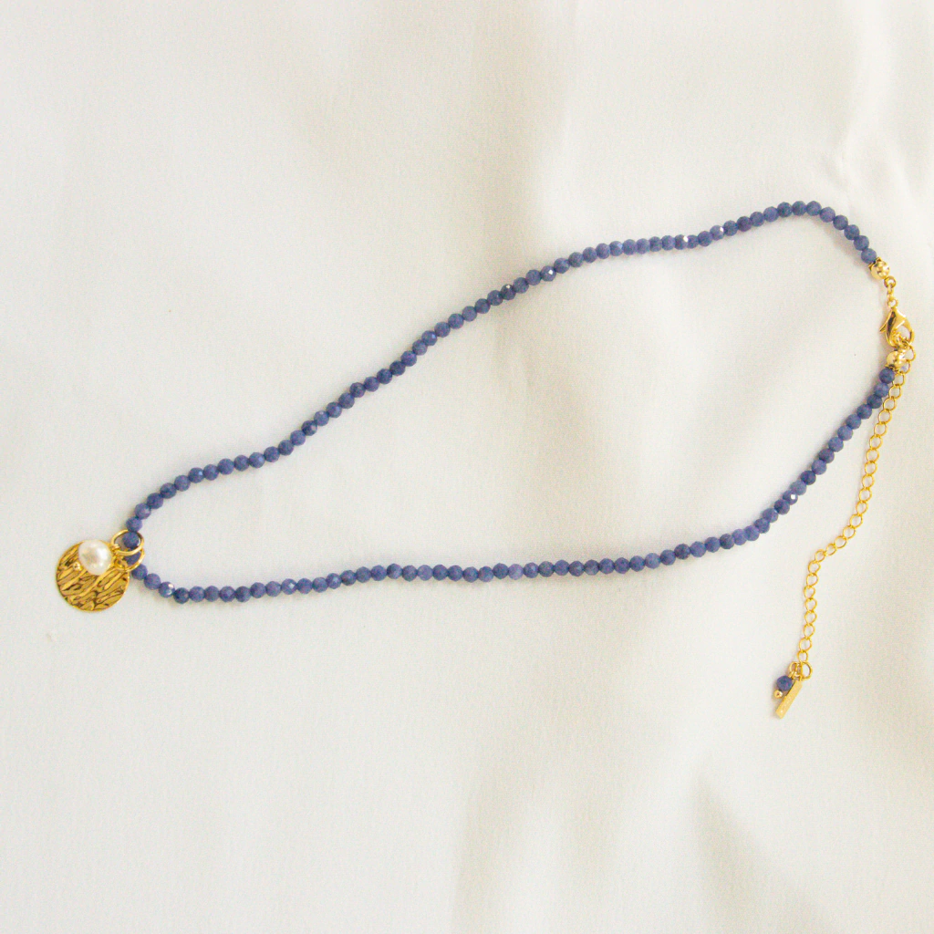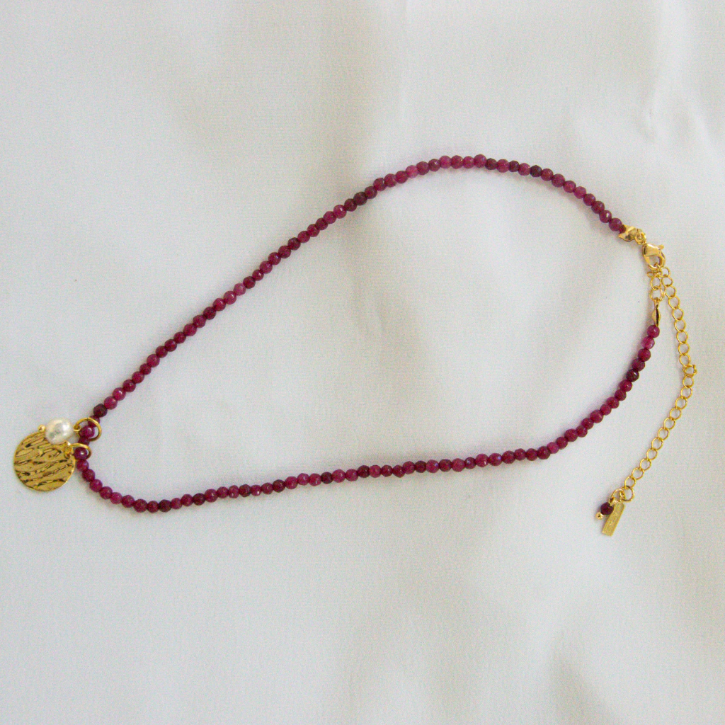 Colar de jade natural com medalha ondulada em banho de ouro 18k e pérola narural barroca.